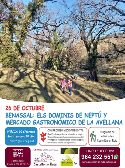 Precios, duración y punto de encuentro√ Precio: 10 € / persona. Gratis para menores de 10 años. (Incluye seguros) √ Punto de encuentro: 9:30 h. BENASSAL (piscina municipal) √ Finalización: 12:30 h. BENASSAL (mercado gastronómico) |